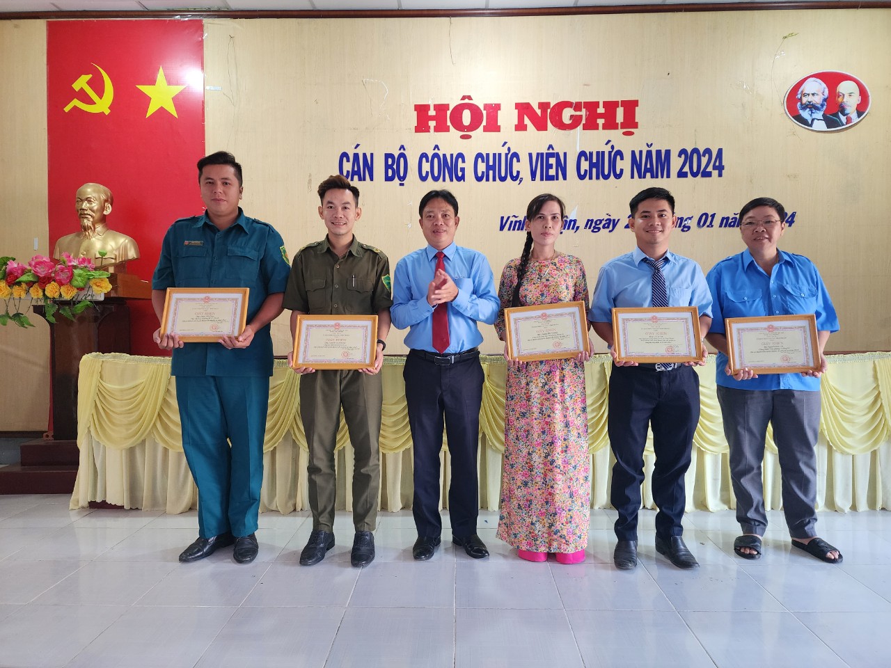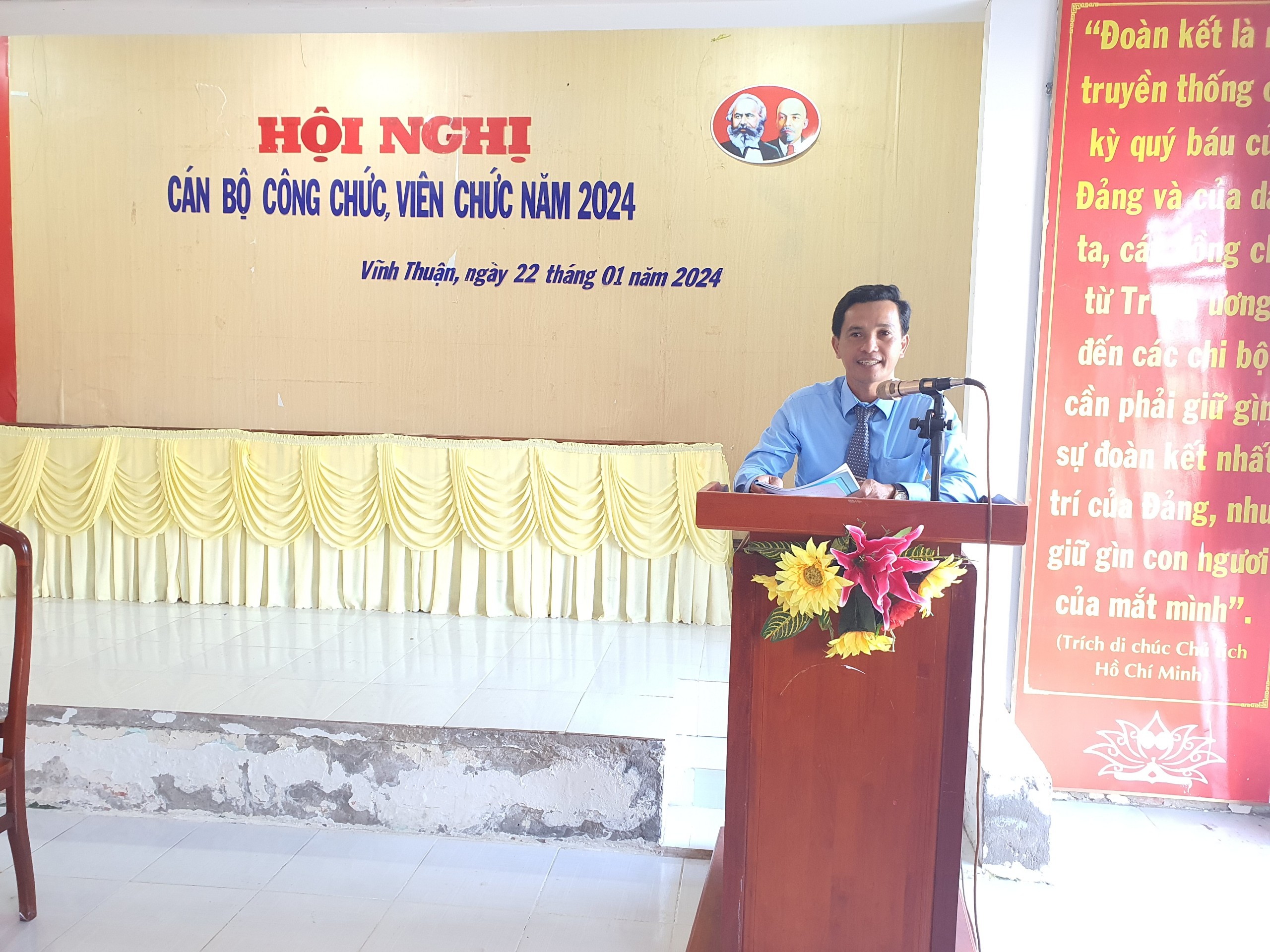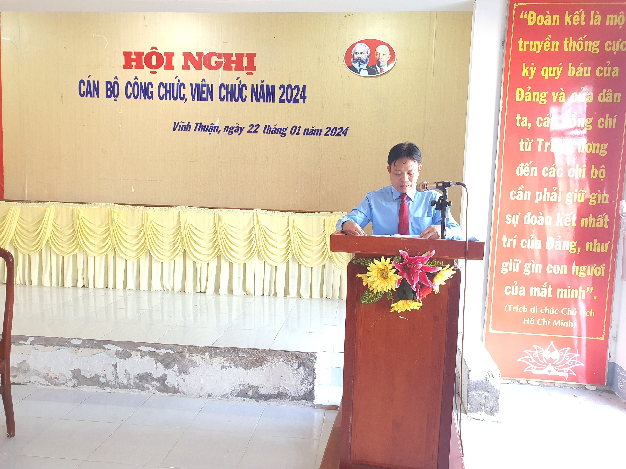 Thực hiện Công văn số 34/LĐLĐ, ngày 22/12/2023 của Ban Thường vụ Liên đoàn lao động huyện Vĩnh Thuận về việc phối hợp tổ chức Hội nghị cán bộ công chức, viên chức người lao động năm 2024. Chiều ngày 22/01/2024, CĐCS xã phối hợp với UBND xã tổ chức Hội nghị cán bộ công chức, viên chức năm 2024. Dự và chỉ đạo Hội nghị có đ/c Phan Thị Cẩm, HUV, Bí thư Đảng ủy xã; đ/c Tôn Quốc Hòa, PBT. Đảng ủy, CT. UBND xã; đ/c Đặng Văn Toàn, PCT. HĐND, CT. CĐCS xã; cùng toàn thể đoàn viên công đoàn, các Ngành đoàn thể, Công an, Quân sự xã.